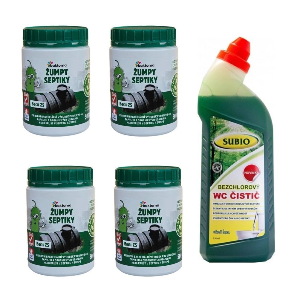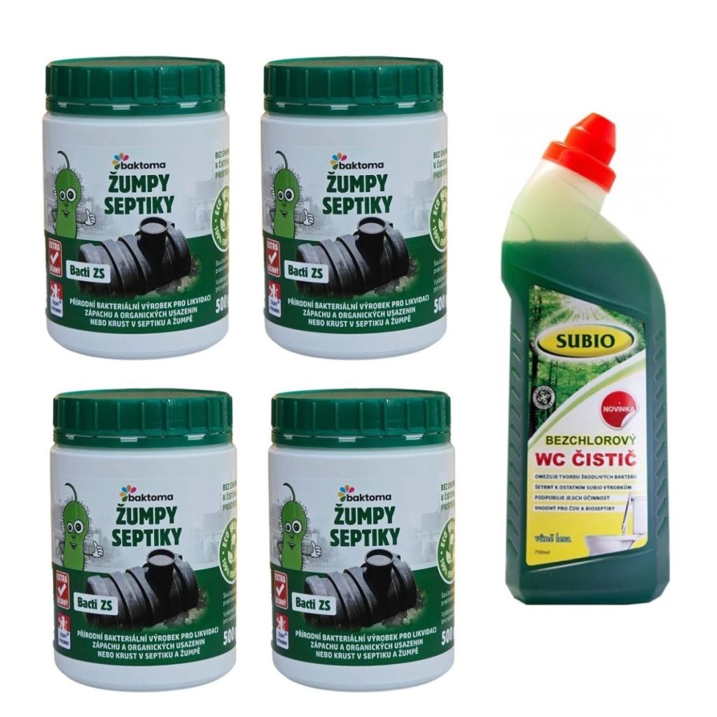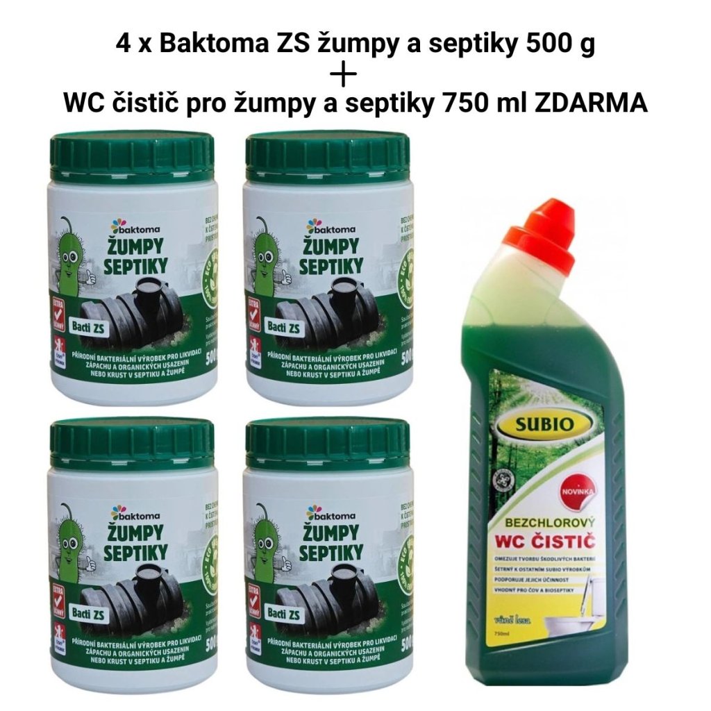 Nejlepší základní kombinace pro majitele žump a septiků. Pokud chcete, aby bakterie v septiku a žumpě fungovaly co nejlépe, nesmíte je zabíjet agresivní chemií z čisticích prostředků. Nejčastější problém bývají WC čističe. Obsahují chlór, který bakterie ničí a ty vám pak fungují jen v omezené míře. Neutrácejte zbytečně a využijte náš výhodný balíček, 4 balení kvalitních bakterií do septiku a žumpy Baktoma Bacti ZS a k tomu ZDARMA bezchlórový WC čistič, který bakterie nezabíjí, ale naopak podporuje.