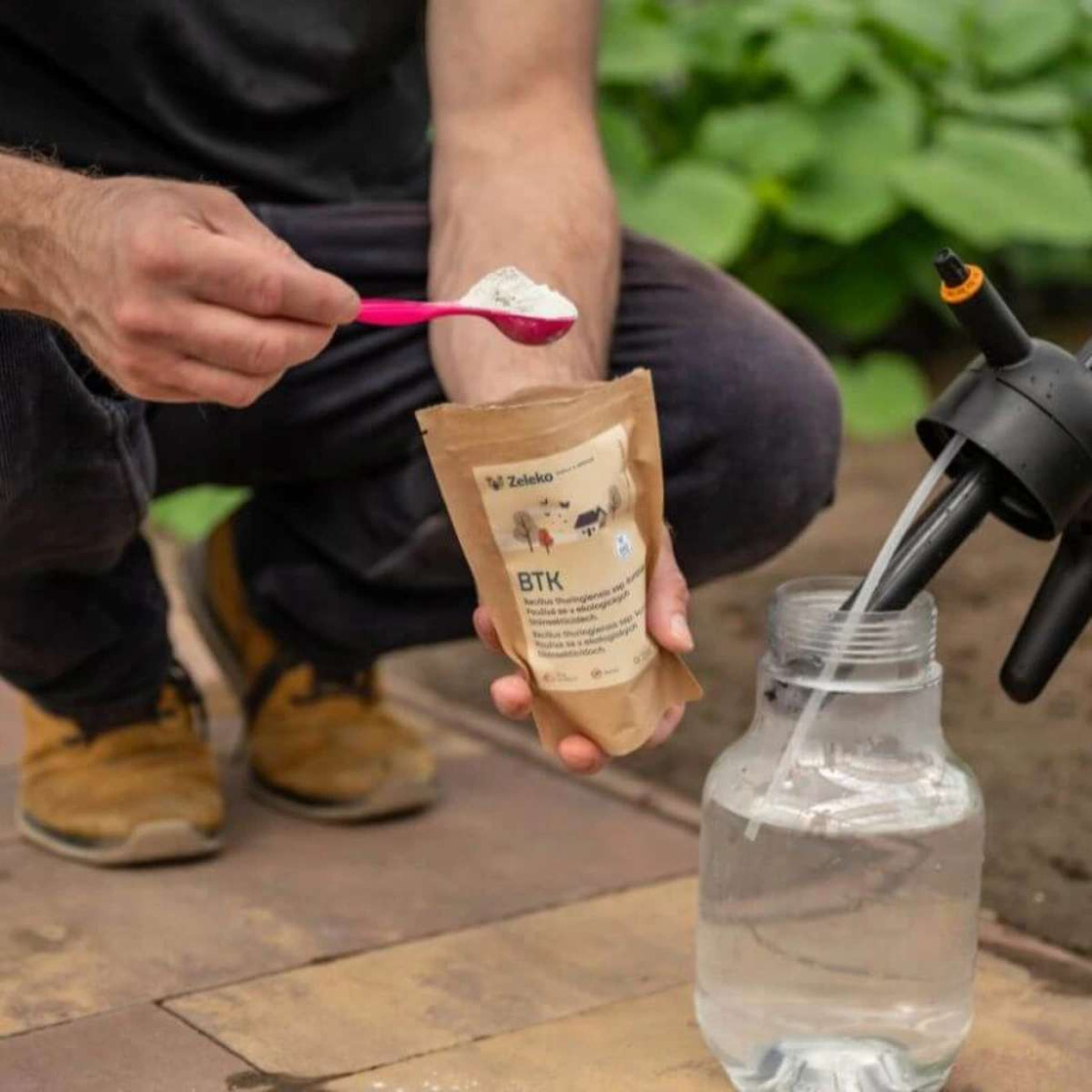15 - 20 g přípravku BTK rozmíchejte ve 20 l vody a aplikujte postřikovačem na plochu 10 x 10m. Stejný postup zopakujte za 4 dny. Aplikujte navečer, ne na přímém slunečním záření.